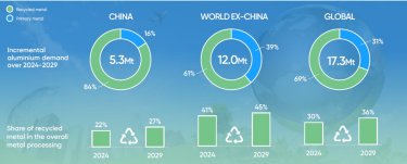 What is driving this growth? Certainly, the growing demand for recycled aluminium products. Rusal forecasts the incremental global demand for aluminium is set to reach 17.3 million tonnes by 2029, with recycled aluminium expected to contribute a substantial 69 per cent, compared to 31 per cent from primary aluminium.. In China, the dominance of secondary aluminium will be even stronger, accounting for 84 per cent of the projected 5.3 million tonnes of incremental demand. Overall, the share of recycled aluminium in total metal processing is expected to climb from 30 per cent in 2024 to 36 per cent by 2029.