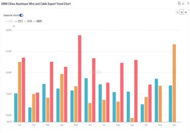 SMM Commentary: Overall, China’s aluminium cable exports have maintained strong growth momentum in 2025. Exports from January to October reached 215,000 tons—already far exceeding the full-year 2024 total. Although October’s export volume dipped 25.2 per cent month-over-month to 17,200 tons, the 20.3 per cent year-over-year increase confirms resilient underlying overseas demand. Product-wise, the ratio of steel-reinforced aluminium stranded conductors to aluminium stranded conductors remained around 2:1 in October, clearly indicating that export growth is primarily fueled by overseas grid upgrades and renewable energy infrastructure projects. As countries worldwide strive to meet renewable energy targets, the road ahead for new energy installations and grid construction remains long, providing medium- to long-term support for China’s aluminium cable exports. Looking ahead to the final two months of 2025, exports may experience seasonal declines due to winter-related slowdowns in grid construction activities in certain regions. Nevertheless, on an annual basis, China’s total aluminium cable exports are well-positioned to approach or even surpass the 250,000-ton mark.